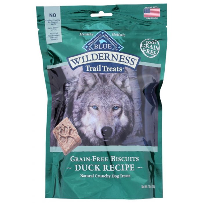 BLUE Wilderness Trail Treats Biscuits are crunchy treats for your meat-loving dog. They are made with the finest natural ingredients enhanced with vitamins and minerals like duck, potatoes and flaxseed, and are free of the grains that contain gluten.