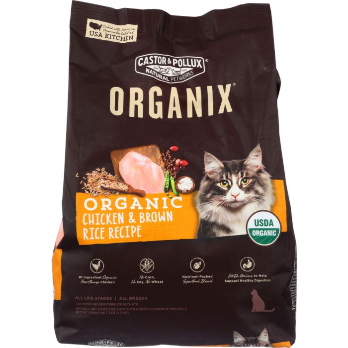 Castor & Pollux Organix Organic Grain Free Dry Cat Food Chicken & Brown Rice Recipe provides 100% complete and balanced nutrition for all life stages of cats. With organic chicken as the first ingredient and high quality chicken meal, made from natural, USDA-inspected turkeys, Organix has a protein-rich highly digestible and grain free foundation.