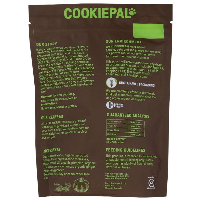 Uncover the goodness of COOKIE PAL: Organic Pumpkin & Chia Recipe Dog Biscuits, now available in a generous 10 oz package. Our Pumpkin & Chia Recipe, meticulously crafted with ground lentils, sprouted buckwheat flour, pumpkin, chia seeds, cinnamon, and ginger, is more than just a treat. It's a source of wellness and nutrition. This blend offers an abundance of goodness, including omega fatty acids and ample fiber. We believe in offering your dog a snack that not only delights their taste buds but also nourishes them with essential ingredients. Treat your furry friend to the best in dog biscuits, and watch them savor each delicious bite that brings a burst of wellness. See their tail wag with delight as they enjoy the taste and health benefits in every nibble.